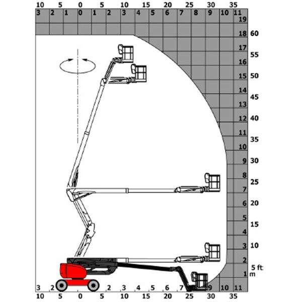 Manitou 180ATJE met 250kg korflast zelfrijdende 4x4 hoogwerker met een werkhoogte van 18.19 meter en een horizontaal bereik van 10.33 meter, gewicht is 7550 kg hoogwerker is zeer geschikt in het ruwe terrein. Met zijn grote horizontale werkbereik is deze machine ideaal om over opstakels te werken. Machine is geschikt voor binnen en buiten gebruik.